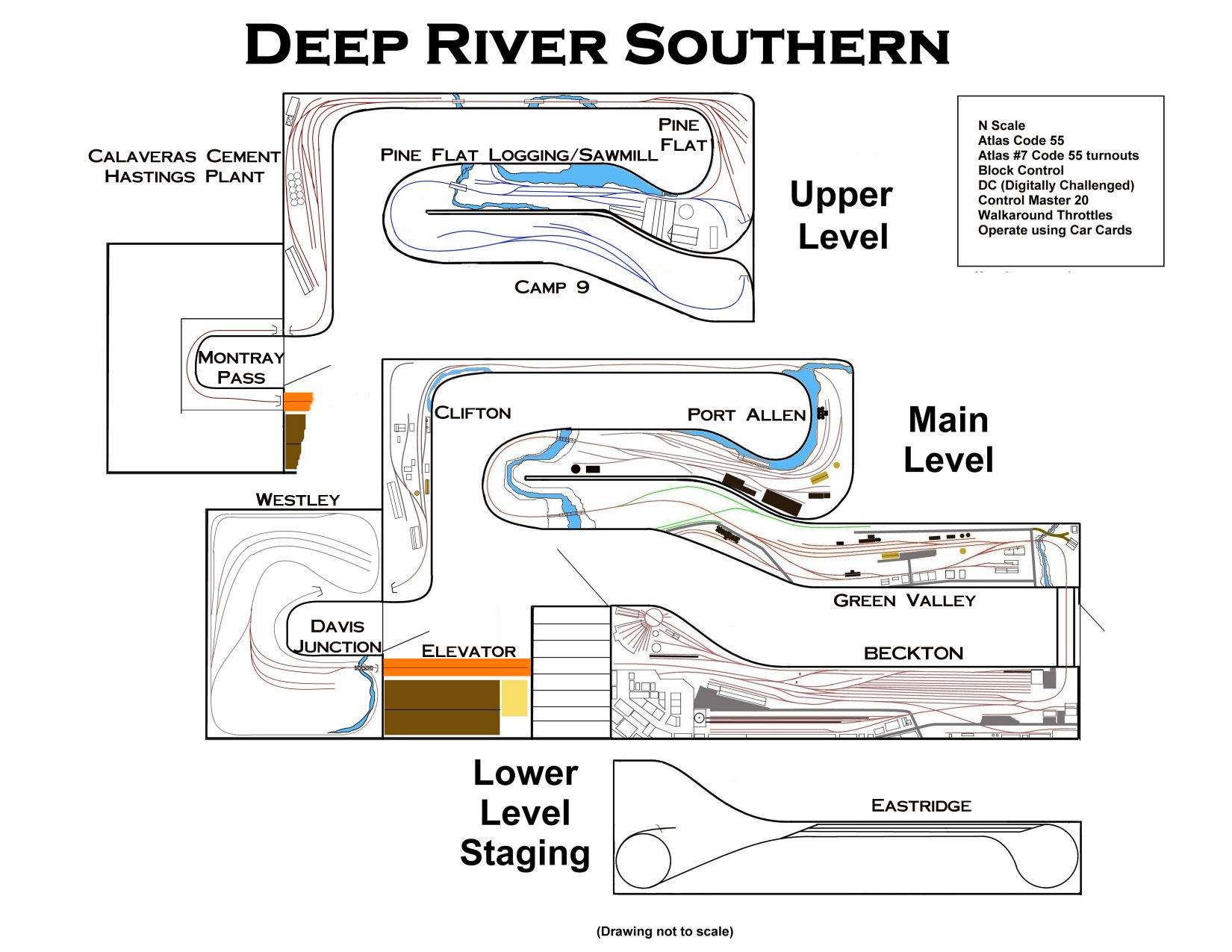 The Deep River Southern is a freelanced N Scale layout set in 1958. It has been featured in several issues of N Scale Magazine and also the Cowcatcher Roundup.