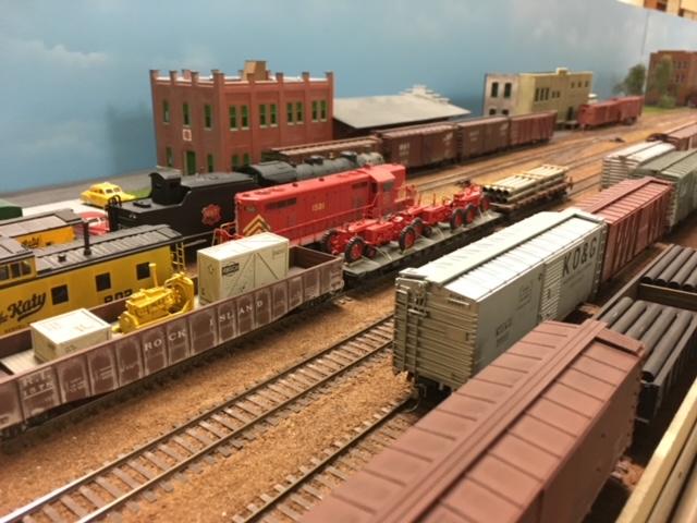 Santa Fe works local industries and finishes with a transfer run to the MKT and Frisco. Scenery is complete with enhancements ongoing. Engines and cars are weathered, and control is NCE with car card forwarding. Locomotives have sound and prototypical momentum and braking. It will slow you down, but you will get used to this rail fan experience.