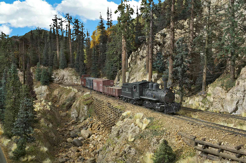 The Pandora & San Miguel depicts the southwest Colorado Rio Grande Southern in September, 1942 and includes that part of the railroad from Ridgway to Rico. The main line is 200 feet with interchange with the D&RGW at Ridgway and staging at both ends of the layout. Operation is easy paced but busy – lots of switching. Helper locos are required on most freights. Layout is about 90 percent sceniced. Locos all have Tsunami sound and run at scale speeds.